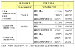 1市町村において住宅が10世帯以上滅失した災害によって、居住していた住宅が全壊するなどの著しい被害を受けた方は、25万円~300万円の支援金が支給されます。支給額は、住宅の被害に応じて支給される「基礎支援金」と住宅の再建方法に応じて支給される「加算支援金」の合算額となります。ただし、世帯人数が1人の場合には、支給される金額が3/4になります。
