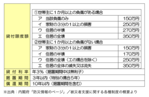 災害によって負傷したり、住居・家財に損害を受けた方には150万円~350万円の貸付けが受けられます。貸付限度額は、「当該負傷のみ」、「住居の半壊」など、損害の程度により決まります。