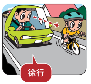 なお、法令では、自転車等との間の十分な間隔、および間隔に応じた安全な速度について具体的な明示はなされていませんが、側方通過時の接触事故を防止するには、十分な間隔を「1.5メートル以上」、安全な速度を「徐行」(おおむね時速10キロ以下)と考えるのが望ましいでしょう。
