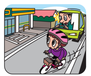 自転車は、13歳未満や70歳以上または一定の身体障害を有する人を除き、車道通行が原則ですが、実際には歩道を通行する自転車も少なくありません。したがって、コンビニやガソリンスタンドなどの道路外施設に出入りするために歩道を横切るときは、その手前で一時停止し(この一時停止は法令で義務づけられています)、自転車の有無を確認する必要があります。相手が自転車の場合は、たとえ衝突しなくても、急停止による転倒でけがをさせてしまうおそれがあるため、十分に注意しましょう。