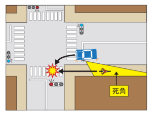 交差点で左折するとき、同じ方向から進行してくる自転車は死角に入りやすく、見落とすことで衝突するおそれがあります。交差点に接近するときは、車道の左端や歩道を走行する自転車がいないかをあらかじめ確認し、その横断を予測しておきましょう。なお、交差点の右左折する際は徐行が義務づけられているため、必ず速度を落として横断する自転車の有無を確認する必要があります。