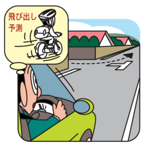 生活道路には見通しの悪い場所が多く、そこから自転車が飛び出してくることがあります。路面の丁字路や十字路の標示にもよく目を配り、小さな交差点を見逃さないようにするとともに、自転車の飛び出しを予測して速度を十分に抑えて走行しましょう。