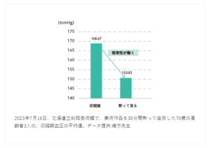 実証実験では、博物館を20~30分間見学すると、高血圧の人の血圧は見学前より下がり、低血圧の人の血圧は見学前より上がる傾向が見られました。博物館浴によって、血圧を適正値に戻そうとする恒常性が働いたためだと考えられます。以下はその代表的な事例です。