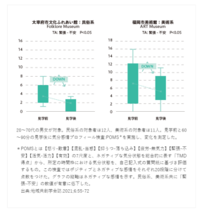 結論としては、対象者の違いには関係なく、黙々鑑賞とおしゃべり鑑賞のどちらでも、心理測定(POMS)のネガティブな項目の数値が下がりました。日常を離れリラックスすることで、脳のスイッチが切り替わるのかもしれません。