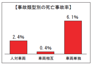 令和6年の交通統計(公益財団法人自動車事故総合分析センター発行)の車両単独事故の発生状況をみると、交通事故(人身事故)件数は全体の4.2%に過ぎませんが、死亡事故では全体の28.3%を占めています。
