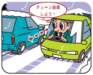 冬期の走行ではタイヤチェーンは必需品ですが、タイヤチェーンを携行していても、まだ大丈夫だろうと考えて装着が遅れ事故につながるケースが少なくありません。「チェーン装着」の指示が出されたときはもちろん、指示がなくても危険を感じたときや、対向車がタイヤチェーンを装着しているときなどは、早めに安全な場所に車を止めてタイヤチェーンを装着しましょう。