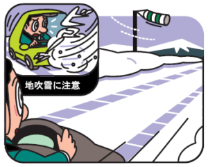 地吹雪とは、積もった雪が強風によって舞い上がる現象のことです。走行中に地吹雪に遭遇すると、ほとんど前方が見えなくなり(このような現象を「ホワイトアウト」といいます。)、きわめて危険な状態となります。地吹雪は風を遮る建物や樹木のない平坦な場所で発生しやすいため、そのような場所を走行するときは十分に注意しましょう。
